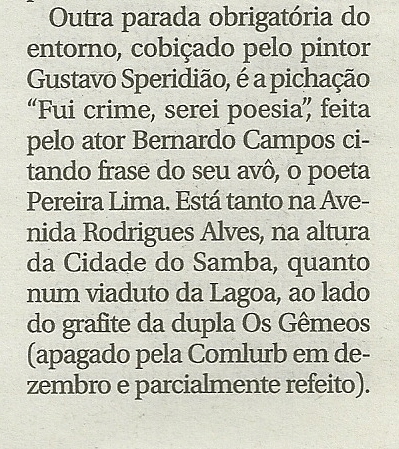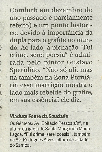 Abaixo, foto do grafite "FUI CRIME, SEREI POESIA" e reportagem de Renata Monti, publicadas na Revista RioShow, suplemento do Jornal